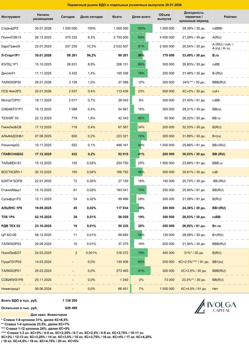 Итоги первичных размещений ВДО и некоторых розничных выпусков на 30 января 2026 г.