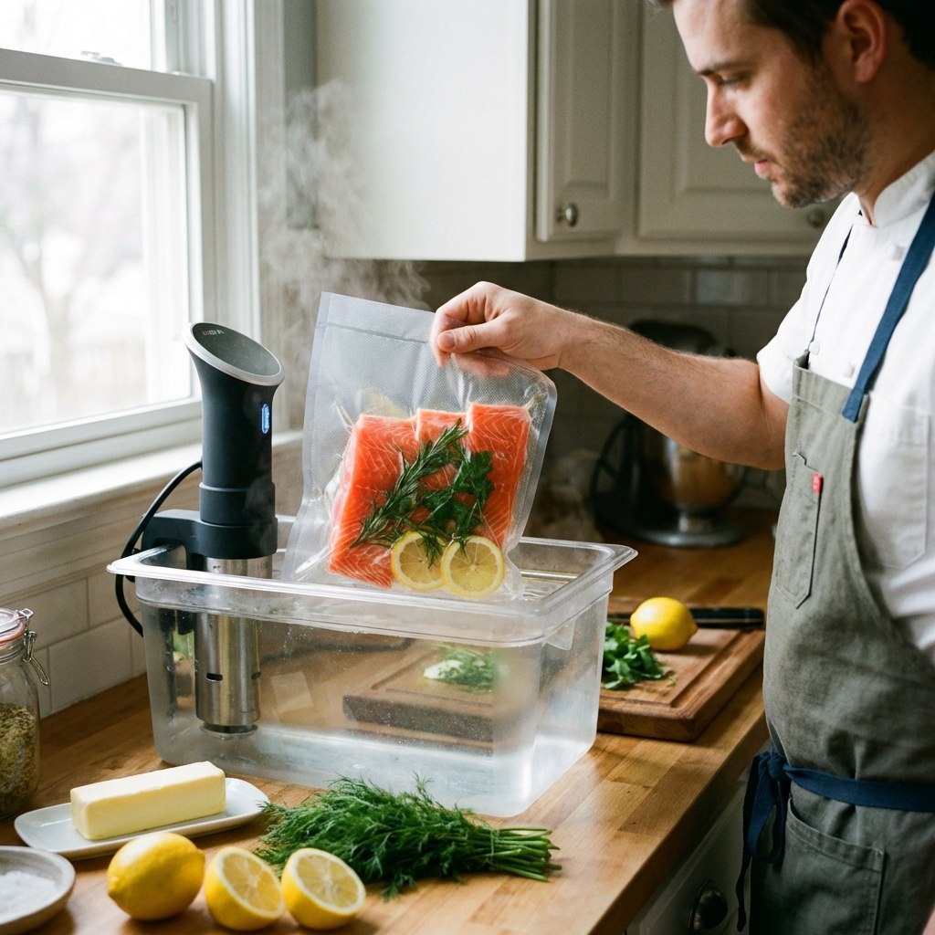 Представьте рыбу, которая тает во рту, сохраняя всю свою природную сочность и аромат. Не сухую, не разваренную, а идеальную — от края до центра. Это не кулинарная фантастика, а реальность метода sous-vide (су-вид), который превращает приготовление рыбы из лотереи в точную науку. Почему этот «низкотемпературный рай» — лучшее, что могло случиться с морепродуктами на вашей кухне? Разберемся по полочкам. Принцип работы: кулинария как точные часы Sous-vide (с фр. «в вакууме») — это приготовление продуктов в вакуумном пакете в водяной бане с точным контролем температуры. Точность: Вы задаете температуру с точностью до 0.5°C (например, 52°C для лосося). Вода не может нагреться выше этой отметки, а значит, и рыба физически не может пережариться. Это снимает главный стресс. Равномерность: В отличие от сковороды или гриля, где жар идет снаружи, в водяной бане тепло мягко и равномерно проникает по всей толщине продукта. Результат — одинаковая степень готовности от края до самой сердцевины. Сохран