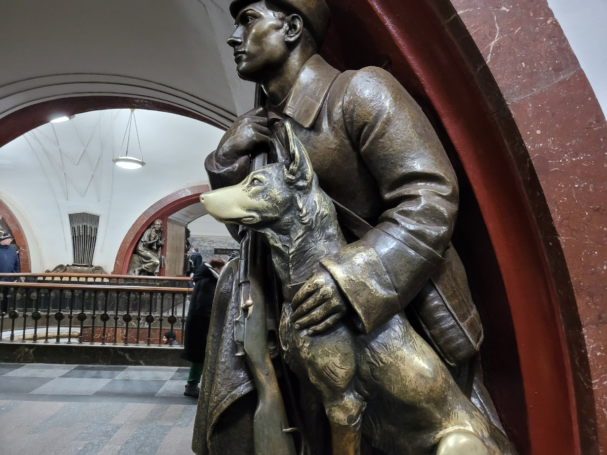 Нос у собаки, как видим, весь блестит. Это от рук пассажиров. Считается, что если потереть нос у собаки и загадать желание, то оно сбудется.