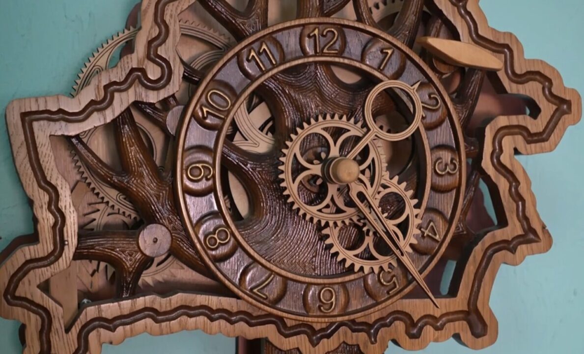 В небольшой белорусской деревне Станьково живет и работает мастер, чьи творения покоряют сердца людей от Запада до Востока: инженер Андрей Мартынюк создает уникальные механические часы, в которых нет ни одной металлической детали — только дерево. По образованию Андрей — инженер электросвязи, а резьба по дереву начиналась как занятие для души. Со временем увлечение переросло в дело жизни, объединив технический склад ума с художественным видением. «Первое время я делал часы чисто ради механики. Основное направление было упор на механизм. Потом я уже стал использовать тематики различные для изготовления часов, резные панели», — рассказал Мартынюк. Изготовление прибора начинается не в мастерской, а за компьютером, с инженерных расчетов и 3D-моделирования. Затем подключаются современные станки с числовым программным управлением (ЧПУ), но ключевой этап — ручная подгонка, сборка и ювелирная регулировка деревянного механизма. В каждое произведение, по словам автора, заложена идея — от впечатле