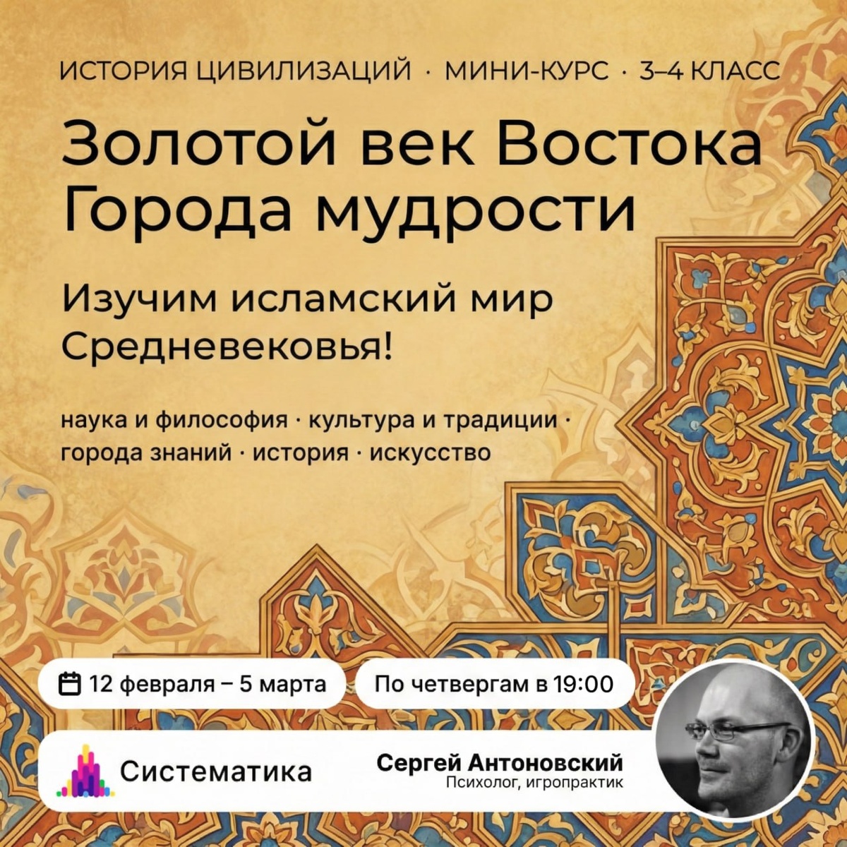! Золотой век Востока. Города мудрости и света Наследие Восточных цивилизаций Средневековья — это не только религия, но и центры науки, искусства и технологий, чьи открытия повлияли на мировую историю и культуру. 🔘Занятия проходят раз в неделю по четвергам в 19:00 (мск) 🔘Подключайтесь онлайн, чтобы задавать вопросы преподавателю 🔘Если пропустили — смотрите занятие в записи на платформе Программа курса: 📜 Города знаний: Багдад, Кордова, Самарканд Как выглядели эти города? Визуализация, карты, архитектура. Дом мудрости в Багдаде — библиотека, где переводили античных философов. Производство бумаги, ковров, ароматов, керамики, стекла. 📜 Астрономы, медики, математики, поэты Ибн Сина (Авиценна), аль-Хорезми (основа алгебры), Омар Хайям. 📜 Религия и культура Основы ислама: 5 столпов, Коран, отношение к знаниям. Мечети, арабская каллиграфия, запрет на изображение людей и расцвет орнамента. Сказки «1001 ночи», история Шахразады, Синдбада, магии и морали. 📜 Ремёсла и торговля Прои