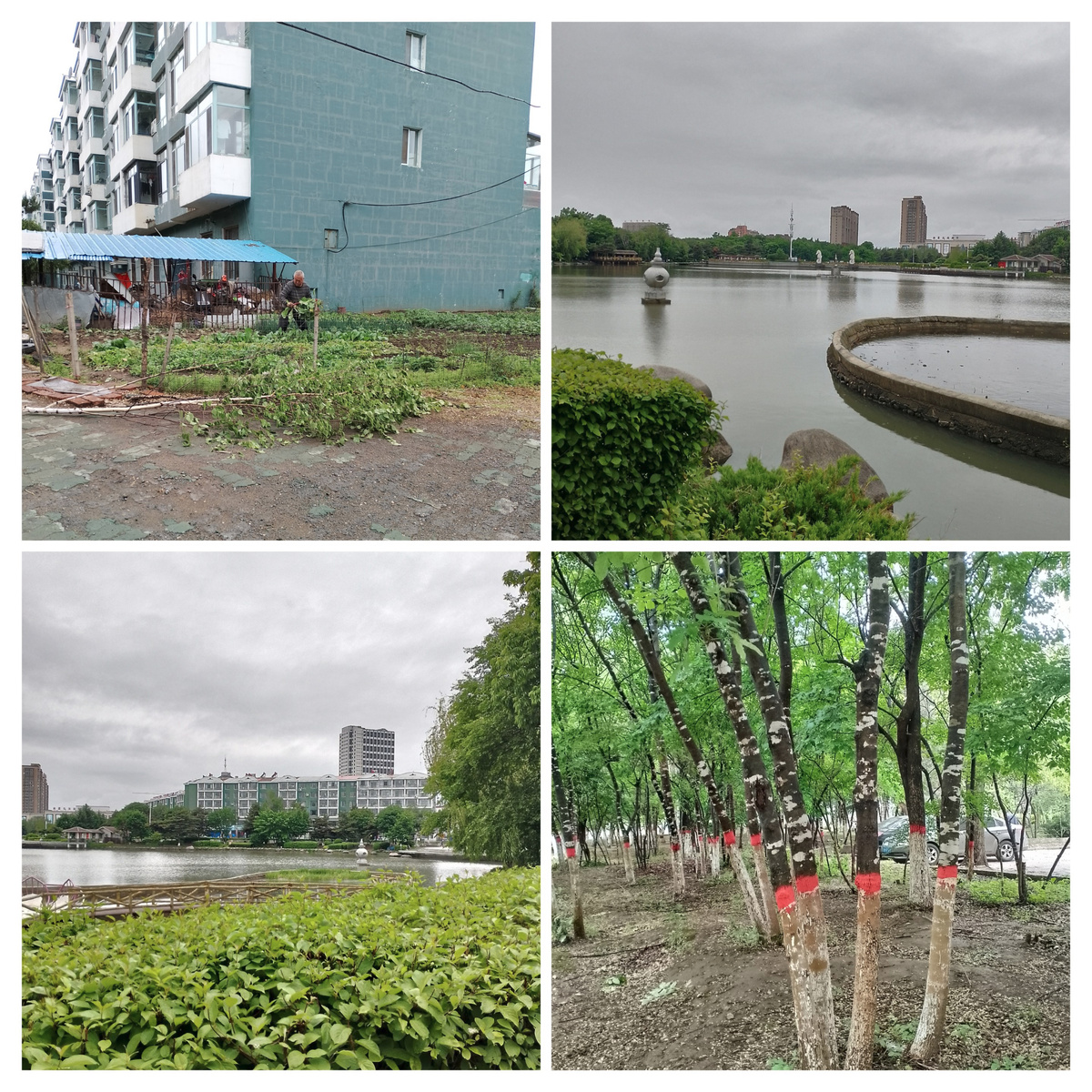 Изучая план города и отзывы,мы знали что здесь протекает небольшая речка,местами похожая на пруды.И в районе города на ее берегах разбит большой парк.И всё это находится совсем недалеко от нас,практически за нашим отелем "Хань Тин".Вернувшись накануне из Яньцзи,выспавшись,мы вышли туда погулять.Небо с утра опять было в равномерных тучах,но хоть без дождя пока.Взяли зонтики и пошли. Проходим задворки.Здесь среди многоэтажек бегают курочки,на берегу чистят перышки утки.А какой-то дедушка возится на грядках. Сам парк на другом берегу реки.Через реку перекинуты два красивейших мраморных моста.Около одного старинная пагода.Между мраморными-деревянный длинный мост -настил.Он ведет к скульптуре в середине реки. В парке красивая зелень и дорожки.Гуляют пожилые люди,пока остальные жители на торговых улицах зарабатывают свои юани. Вдалеке видим еще мраморные скульптуры морских коньков,идем туда.Здесь более плоский переход через реку.Но тоже мраморный настил.На плитах морская живность.С моста вид