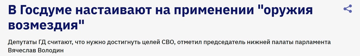 поражения для достижения целей специальной военной операции. Об этом сообщил председатель Госдумы Вячеслав Володин. Комментируя заявления Зеленского, Володин отметил, что они в очередной раз подтверждают его политическую и управленческую неадекватность. По его словам, глава киевского режима, разрушив государственность Украины и погубив огромное количество собственных граждан, продолжает создавать новые угрозы и проблемы для украинского населения уже на следующей неделе. В Госдуме подчёркивают: единственный разумный путь для Киева — следовать договорённостям, достигнутым между Владимиром Путиным и Дональдом Трампом в Анкоридже. Любые попытки их саботировать лишь усугубляют положение Украины и ведут к дальнейшей эскалации. Отдельно Володин подчеркнул, что российские войска продолжают наступление, а депутаты Госдумы настаивают на применении более мощного вооружения — так называемого «оружия возмездия». «Меньше слов — меньше проблем», — резюмировал председатель Госдумы, подчеркнув, что