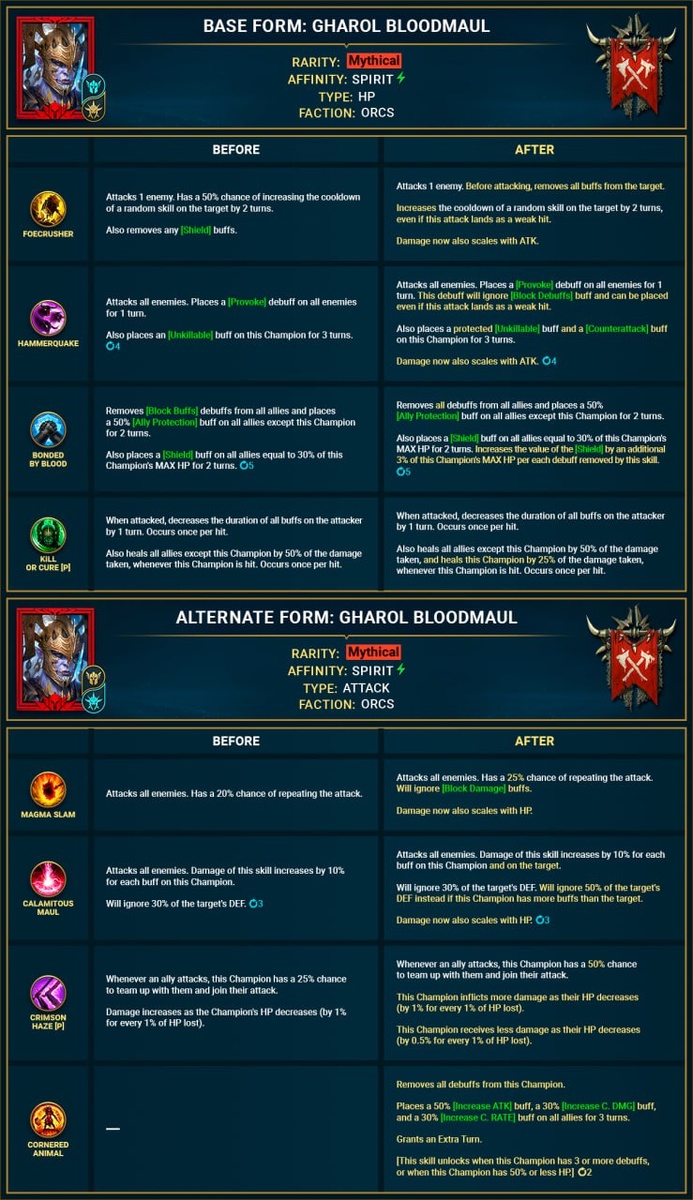 Базовая форма А1 - Погибель Врагов Атакует 1 врага. Перед атакой снимает все положительные эффекты с цели. Увеличивает время восстановления случайного навыка цели на 2 хода, даже если эта атака наносит слабый удар. Теперь урон также зависит от силы атаки. А2 - Грозный молот Атакует всех врагов. Накладывает на всех врагов [Провокацию] на 1 ход. Этот штраф игнорирует бонус [Блок Штрафов] и может быть наложен, даже если атака окажется слабой. Также накладывает на этого Чемпиона защитный бонус [Неуязвимость] и [Контратаку] на 3 хода. Урон теперь также зависит от атаки. А3 - Кровная Связь Снимает все негативные эффекты со всех союзников и накладывает на всех союзников, кроме этого Чемпиона, бонус [Щит Союзников] 50% на 2 хода. Также накладывает на всех союзников бонус [Щит], равный 30% от максимального здоровья этого Чемпиона, на 2 хода. Увеличивает значение [Щита] на дополнительные 3% своего максимального запаса здоровья этого Чемпиона за каждый снятый этим навыком дебафф. Палач и Лекар