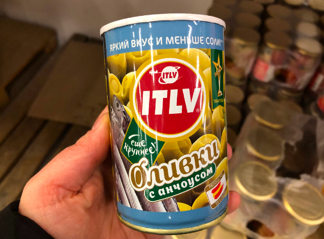 Появились зеленые оливки с анчоусом. Банка металлическая, с ключом — удобно открывать. Масса 300 грамм, производитель Испания. Цена — 78 рублей.