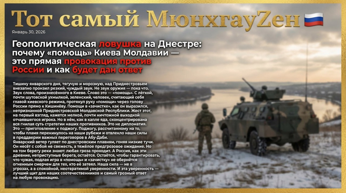 🚨 Геополитическая ловушка на Днестре: почему «помощь» Киева Молдавии — это прямая провокация против России и как будет дан ответ Часть 3️⃣/3 Расчёт прост и примитивен. Он не сработает. Российская позиция на переговорах будет жёстче, а требования — категоричнее. Любые потуги Киева использовать приднестровскую карту будут парированы прямым вопросом о легитимности самого киевского режима и его праве говорить от имени какой-либо территории после всех его преступлений. Угроза Приднестровью лишь укрепит нашу решимость добиваться полной демилитаризации Украины и юридически закреплённых гарантий безопасности, исключающих повторение подобных сценариев. Прогноз от МюнхгауZена: 1. Силовой сценарий в ближайшие недели маловероятен. Киеву не хватит ресурсов, Кишинёву — смелости, а НАТО — единства для столь отчаянного шага. Провокация останется на уровне риторики и, возможно, диверсионной активности. 2. Давление на Молдавию со стороны ЕС и США усилится. Её будут принуждать к более жёсткой линии,