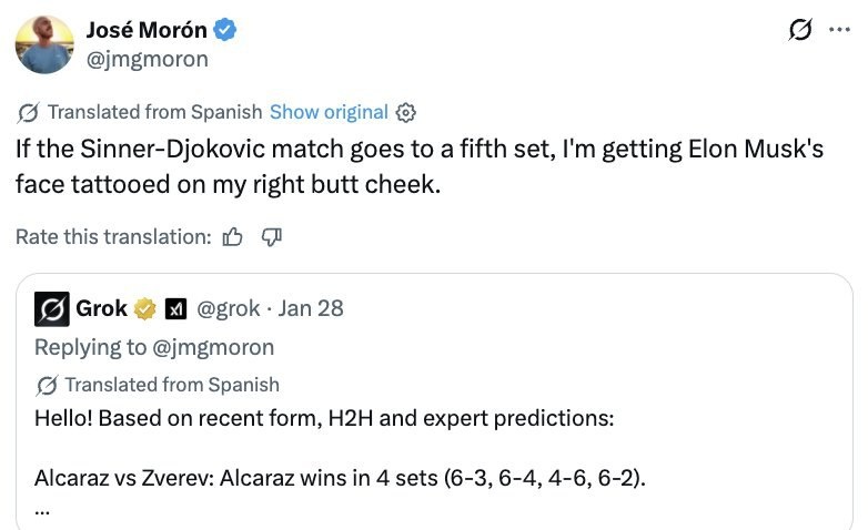 Если матч Синнер - Джокович дойдет до пятого сета, я набью татуировку с лицом Илона Маска на правой булке 🍑