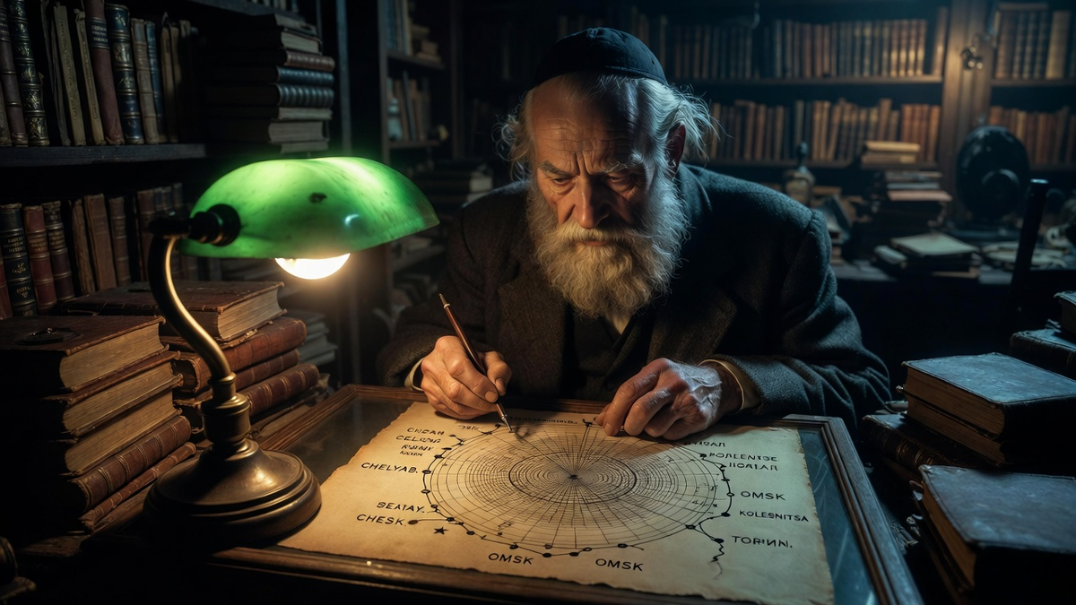 Игнатий замер. Это была не карта в обычном смысле. Это была диаграмма, состоящая из концентрических кругов, соединенных прямыми линиями-радиусами. На пересечениях линий и на периферии были нанесены крошечные, но изящные иероглифы и странные пиктограммы, напоминавшие то ли алхимические знаки, то ли обозначения небесных светил. В самом центре композиции был изображен многогранный кристалл, от которого расходились лучи. Но поразило Волынского другое. Поверх этой древней схемы, уже более свежими чернилами, были пунктиром нанесены другие отметки. Он узнавал аббревиатуры железнодорожных станций: «ЧЕЛЯБ.», «ОМСК», «ИРКУТСК», «ХАБАРОВСК», «ВЛАДИВОСТОК». И одна точка, не совпадавшая ни с одной реальной станцией, была помечена звездочкой и тем самым словом — «КОЛЕСНИЦА».