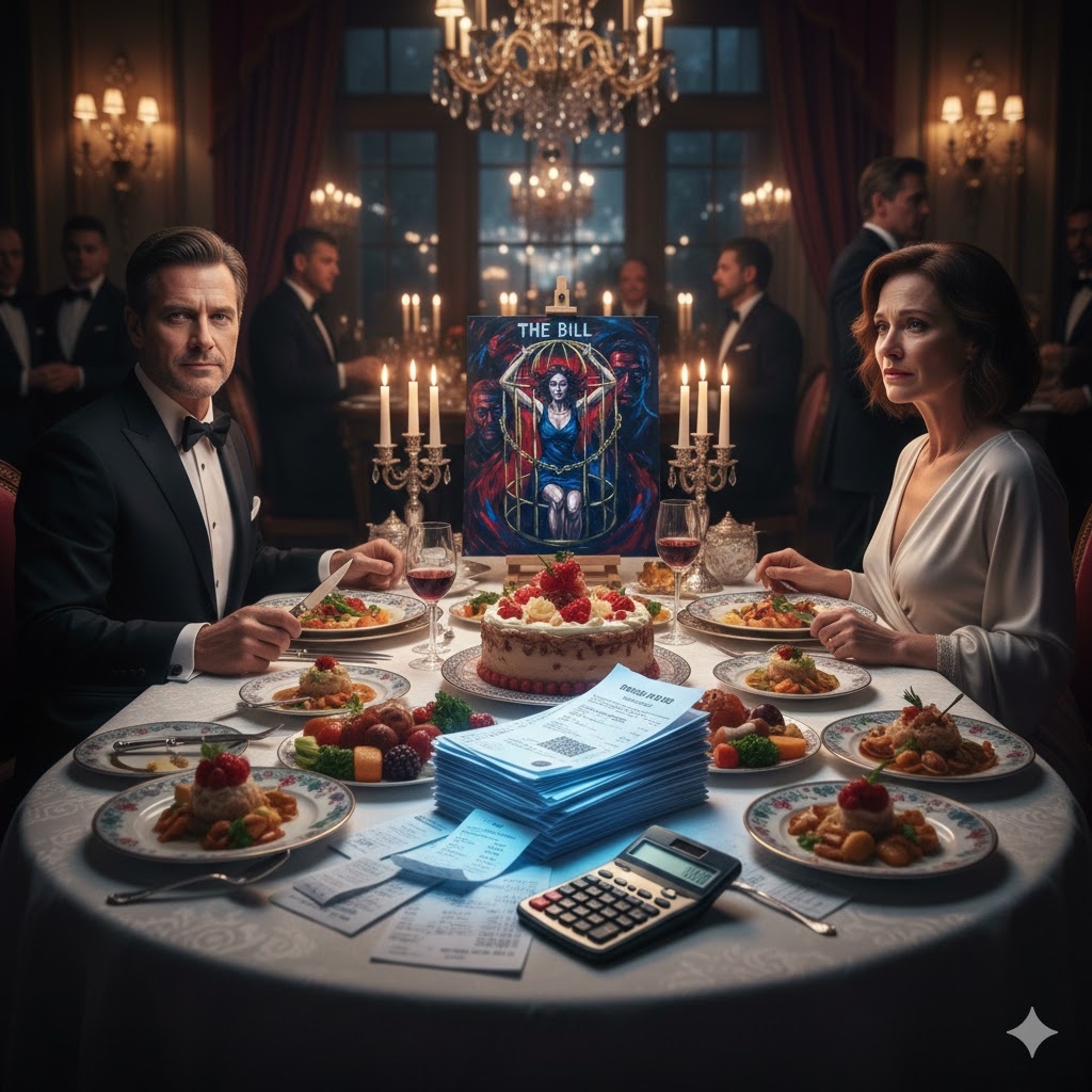 Гул голосов стих, когда она вошла. Люди расступались, провожая её взглядами — в них читалось жадное любопытство. Но Марина видела только одного человека. Андрей стоял в центре зала перед полотном «Счёт». На картине был изображен роскошный обеденный стол, превращающийся в гильотину, где вместо лезвия — золотая банковская карта.