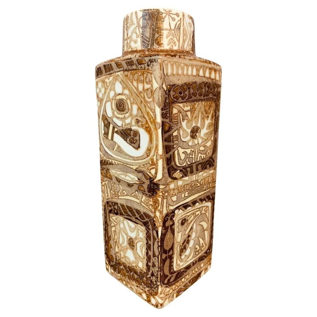 NILS THORSSON Royal Copenhagen, 1969 Редкая ваза Royal Copenhagen «Baca», дизайн Нильса Торссона (1898–1975), создана в 1960-х, производилась в 1969–1974 гг. Матово-коричневая глиняная ваза из глинозема, украшена стилизованным орнаментом, на четырёх сторонах — абстрактные птицы, цветы и существа, сложный рельеф. Маркировка: 719/3259. Размеры: 7,5×7,5×22,5 см. Торссон, с 1912 года в Royal Copenhagen и выпускник Академии (1917), стал самым плодовитым дизайнером фабрики, руководил Aluminia и Royal Copenhagen. Создал линии Solberg, Marselis, Tenera, Baca, Diana. Его керамика середины века сегодня ценится коллекционерами и любителями винтажа. Стоимость лота: 47 000 ₽ Подробнее на нашем сайте