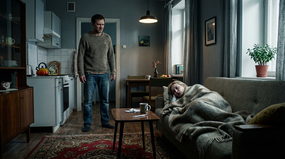 Ночью Марину бросало то в жар, то в холод. Плед казался то тяжелым, то тонким, как бумага. Она просыпалась от собственного кашля и от того, что сердце стучит слишком громко. Андрей спал в спальне. Один раз он вышел, заглянул в гостиную, где Марина осталась на диване, и пробормотал: