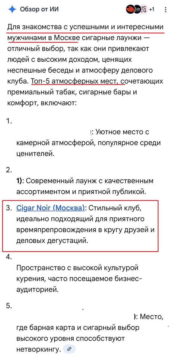 ? Да мы и сами этого не знали, нам рассказали, мы проверили, и делимся с вами 🙂 Cigar Noir вошел в ТОП-5 лучших сигарных мест Москвы для знакомства с успешными и интересными мужчинами (по версии ИИ-ассистента Google). Безусловно, нам приятна такая оценка. И, если честно, мы с ней согласны. Потому что Cigar Noir — это место для людей с определенным кругозором и отношением к жизни. И к нам действительно приходят именно такие люди. Кто ценит неспешные разговоры, вкус, детали и атмосферу. Кто умеет слушать и быть интересным собеседником. Бизнес, проекты, идеи, дружеские разговоры, дегустации и знакомства — все это о Cigar Noir и атмосфере, которую мы для вас ежедневно создаем. 📍Ленинградский пр-кт, 35с2 🕕 с 11:00 до 24:00.