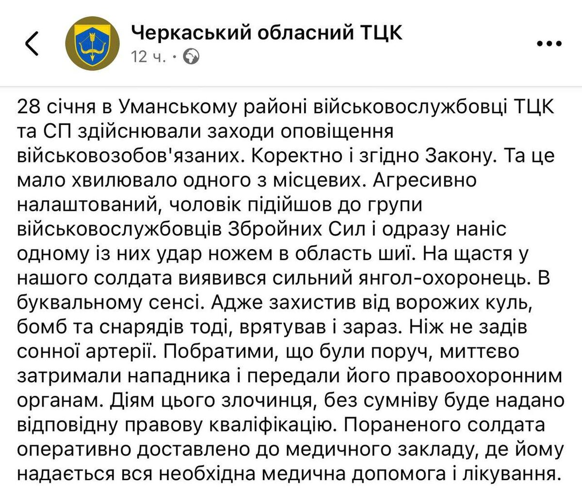 ‼️В Умани Черкасской области мужчина ударил ножом в область шеи карателя ТЦК, - Черкасский областной ТЦК