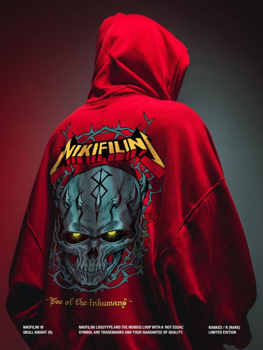 Что будет, если смешать эстетику тёмного фэнтези BERSERK, готику со шрифтами и орнаментами и металл 🤘 Получится зип-худи SKULL NIGHT. Фигура из смерти и войны, которая появляется как предупреждение и угроза для нечеловеческого. Логотип под металлику как вишенка на торте 😘 Мы знаем, что среди аудитории есть фаны такого рода минимализма. P.S. Рыцарь-Череп и на футболке ENEMY OF APOSTLE