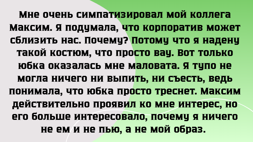 И тут слышу, как за дверью идет соседка с собаками. Я ее не знаю, видела пару раз, но слышу по цоканью когтей, когда они мимо идут. В общем, я вся взмыленная выбегаю к ней, пока она ждет лифт, и слезно прошу ее застегнуть мне платье. Девушка, спасибо вам! Вы мне так помогли. © jyli.aaaa - У нас устроили корпоратив, всем разослали приглашения, где было сказано, что обязательно нужно одеться в определенном стиле. Я видел приглашение, но не читал его, потому что не думал, что там что-то важное будет. Прихожу на корпоратив, а там все в черной одежде: смокинги, платья, костюмы красивые. И только я единственный был весь в белом. На следующий же день позвонили и сказали: «Вы подрываете имидж компании и нарушаете единую атмосферу». Короче, больше никогда не буду так пренебрежительно относится к приглашениям.
