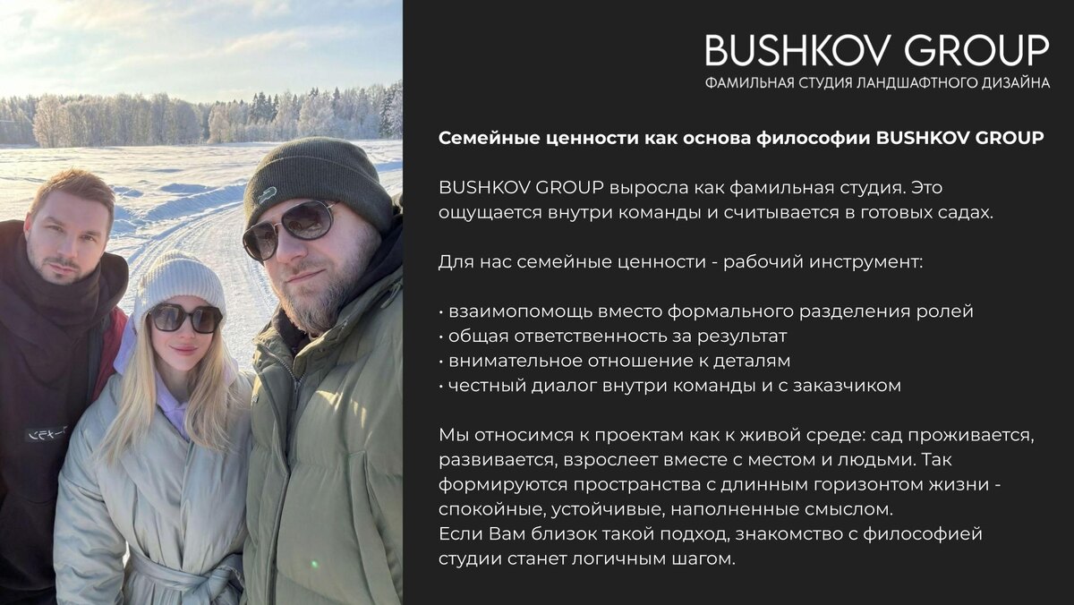 В профессиональной среде часто говорят о стратегии, конкуренции и росте. Эти слова важны, но для нас они часто вторичны. В основе BUSHKOV GROUP лежит совсем другое - отношения между людьми. Мы изначально создавали студию как живое сообщество, где доверие, уважение и общая ответственность формируют качество результата.