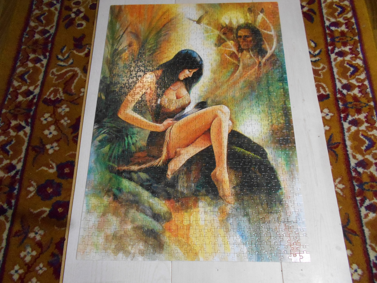 Всем привет. На улице зима, световой день короткий. Чем заняться длинными зимними вечерами честнОму народу? Можно смотреть телевизор, читать книги, а можно смотреть фильмы, вышивать крестиком, вязать теплые носки и варежки, пробовать готовить какие нибудь новые вкусняшки... А мы собираем вечерами пазлы. Кстати, очень полезное занятие, особенно с возрастом. Пазлы помогают сохранять ясность ума, мышление. Ведь любые головоломки, стимулируют мозговую активность. Врачи говорят, что это может помочь приостановить увядание мозговой деятельности, которое происходит с возрастом, и даже предупреждает болезнь Альцгеймера. А манипулирование небольшими деталями, позволяет не терять ловкости рук. Но хватит о грустном. Представляю вам очередное наше творение. Собранная картина называется "Индейское лето". Картина получилась большая 68 х 48 см. Собирали её 10 дней. И хотя говорят, что пазлы помогают бороться с тревогой и стрессом, были у нас и нервные моменты, когда что то не сходилось. Но в целом, к