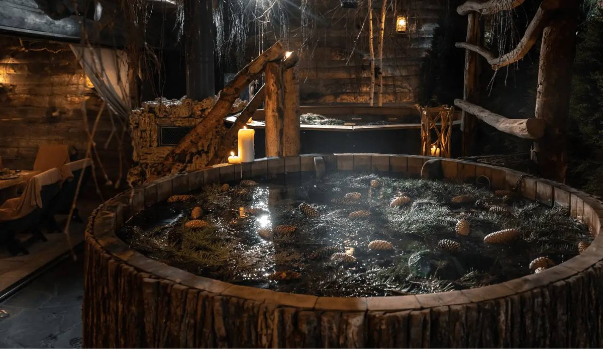 Здесь есть два общественных заряда и пять стилизованных банных номеров. Между парениями можно отдохнуть в большой лаунж-зоне с баром и удобными креслами — перекусить или спокойно поужинать. В спа-меню входят индивидуальные парения, массажи, скрабы, травяные ингаляции и традиционные чаепития.
