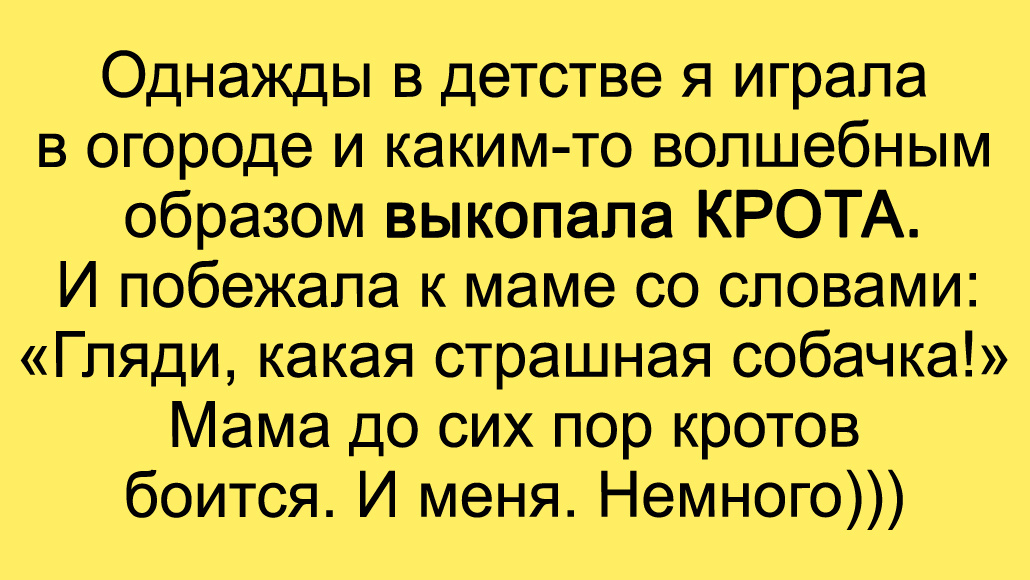 - Однажды в детстве я играла в огороде и каким-то волшебным образом выкопала КРОТА. И побежала к маме со словами: «Гляди, какая страшная собачка!» Мама до сих пор кротов боится. И меня. Немного.