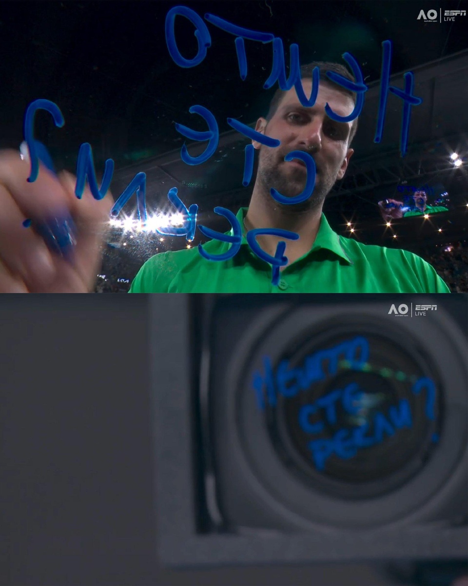 Новак Джокович написал на камере «Нешто сте рекли?» после победы над Янником Синнером в полуфинале Australian Open 2026.