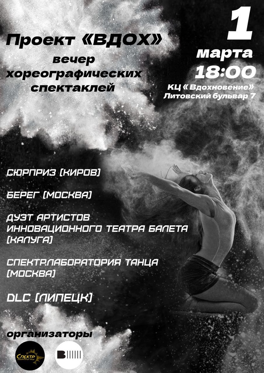 Москва Проект «ВДОХ» приглашает встретить весну в компании современного танца! 1 марта 2026 в 18:00 на сцене Культурного центра "Вдохновение" соберутся настоящие амбассадоры хореографического искусства В программе 6 уникальных спектаклей, такое нельзя пропустить! УЧАСТНИКИ ЧЕТВЕРТОГО ВЕЧЕРА ХОРЕОГАФИЧЕСКИХ СПЕКТАКЛЕЙ: • Танцевальная компания берег (Москва) • Дуэт артистов Инновационного тетра балета (Калуга) • Театр танца "Сюрприз" (Киров) • Компания современного танца "Данс Ленд Клаб" (Липецк) • Спектр. Лаборатория танца (Москва) КОГДА 1 марта 2026 в 18:00 ГДЕ Москва, Литовский бульвар 7, КЦ "Вдохновение" БИЛЕТЫ https://iframeab-pre1557.intickets.ru/seance/69967856/ *доступна покупка по Пушкинской карте --------------- Опубликовать своё объявление в канале "Танцоры и хореографы России" жми сюда Опубликовать свою вакансию или резюме в специальном чате для танцоров и хореографов жми сюда
