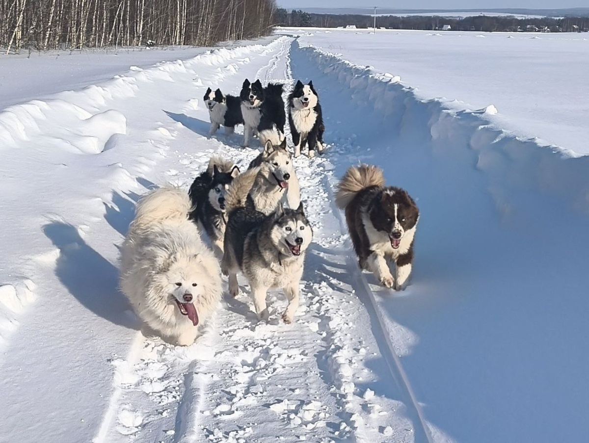 День был по Пушкину – с морозом и солнцем, поэтому я взяла собак и мы отправились топтать сугробы. Точнее, я надеялась, что так будет (как вчера делал Лимон), однако стая, за исключением Кроши и Бублика, предпочла бегать по снегоходному следу, а не прокладывать собственный путь. Хотя, если быть совсем уж честной, то даже по нему было не очень просто идти. Но у меня была цель – «искупать» собак в снегу, заставить их потренироваться без упряжки, на свободе. Поэтому пришлось лезть в сугробы самой. И тогда стая радостно меня в этом поддержала и отправилась бороздить снежные просторы полей. А что меня удивило больше всего, так это то, что вместе со стаей радостно бегал Квас! Только в сугробы, к счастью, не лазил. Но во всей этой общей «тусовке» участвовал. И сердце мое замирало – от радости. И напряжения. Ведь стоит хоть кому-то неудачно «влететь» в большого пса (а в стае на прогулке всей гурьбой якуты, хаски и самоед постоянно так делают), тому «снаряду» не поздоровится! Тем более, с возра