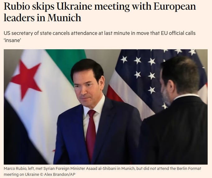 «У американского госсекретаря была запланирована встреча в Мюнхене — с представителями Еврокомиссии, Германии, Польши и Финляндии. Причиной изменений был указан плотный график. Один из чиновников ЕС назвал отмену встречи «безумием», — пишет FT. Рубио же после Мюнхена отправился на встречу с Орбаном. В очередной раз США показывают еврочиновникам — Вашингтон ведёт по Украине свою игру, а не подыгрывает безумцам из Брюсселя. 🌐 За Русский Мир©Резервный📣Наш Чат✔️Подпишись‼️