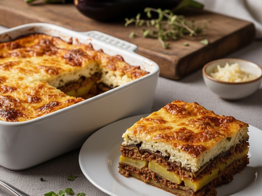 - Сборка и запекание мусаки: Разогрейте духовку до 180°C. В форму для запекания (24×32 см) выложите слой картофеля, затем половину баклажанов, половину мясной начинки. Повторите слои: оставшиеся баклажаны и оставшийся фарш. Залейте соусом бешамель, равномерно распределяя по всей поверхности. Посыпьте оставшимся тёртым сыром. Запекайте 45 минут при 180°C до золотистой корочки.