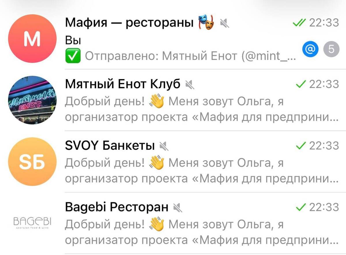 Он ищет рестораны. Задача: найти площадку для мероприятия. Критерии, бюджет, район — всё закидываю агенту. Он находит подходящие рестораны, достаёт их контакт в Telegram и сам пишет — бронь, детали, условия. Пока есть нюансы: — Telegram может забанить аккаунт за спам, если уходит много сообщений — Не все рестораны указывают Telegram для связи Можно было настроить звонки, но решил начать с текста — проще и быстрее для теста. 📱 @moderator.top | 🎭 @sellersmafia 🤝 moderator.top/forum