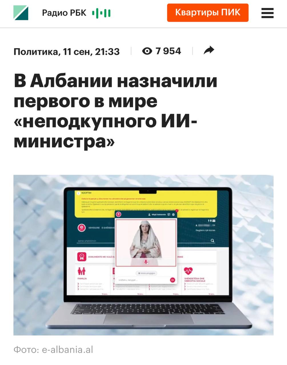 В Албании назначили первого в мире «неподкупного ИИ-министра»