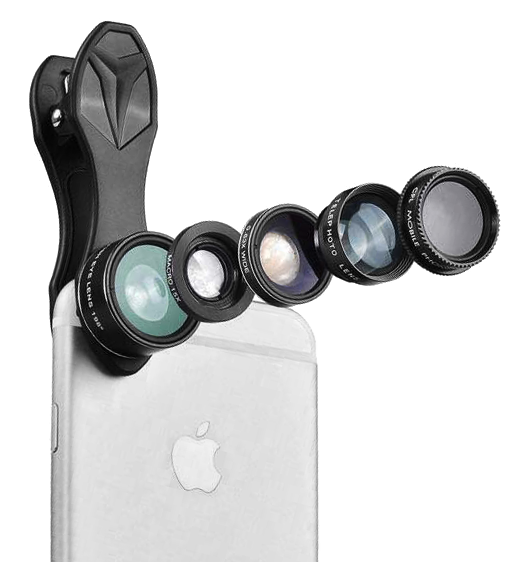 Комплект включает в себя пять различных типов объективов: Fisheye (рыбий глаз), Macro (макро), Telephoto (телеобъектив), Wide Angle (широкоугольный) и дополнительный линзовый фильтр. Это позволяет пользователям разнообразно подходить к съемке, создавая уникальные эффекты и улучшая качество фотографий.