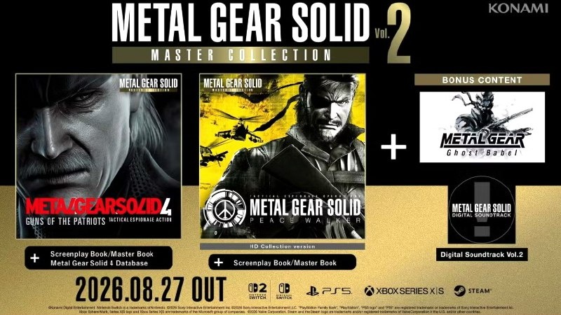 2 — второй том сборника классических игр серии. В сборник, войдут: 1. Metal Gear Solid 4: Guns of the Patriots. К игре будут добавлены дополнительные материалы, например, сценарий и текстовый гид. 2. Metal Gear Solid: Peace Walker. К этой игре также будут бонусы. 3. Metal Gear Ghost Babel. Это старая игра в жанре стелс-экшен, которая была выпущена для Game Boy Color. 4. Цифровой саундтрек Vol. 2. Это сборник музыки из игр. Коллекция выйдет 27 августа 2026 года на ПК, PlayStation 5, Xbox Series X/S, Switch и Switch 2. @dailyhardcore1 Dailyhardcore Подписаться