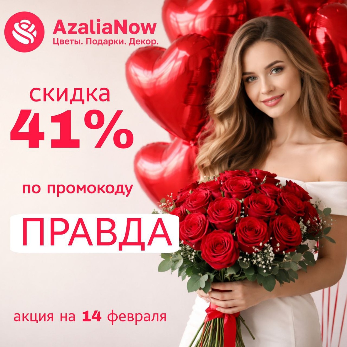❤️ В ассортименте — авторские букеты, классические композиции, подарочные наборы и детали для романтического вечера. Подобрать вариант можно для любимого человека, второй половины или того, кому хочется уделить особое внимание 🌷 К празднику в AzaliaNow собраны готовые решения для поздравлений — цветы, декор и стильная упаковка с удобным оформлением онлайн 📞 По промокоду ПРАВДА действует скидка 41% на весь ассортимент. Оформление занимает всего несколько минут, бесплатная доставка по Москве в трёхчасовой интервал помогает всё организовать вовремя. После регистрации в приложении начисляются 2000 бонусов — их можно сразу списать при покупке 🔥 Переходите в AzaliaNow и подготовьтесь к 14 февраля заранее 💐