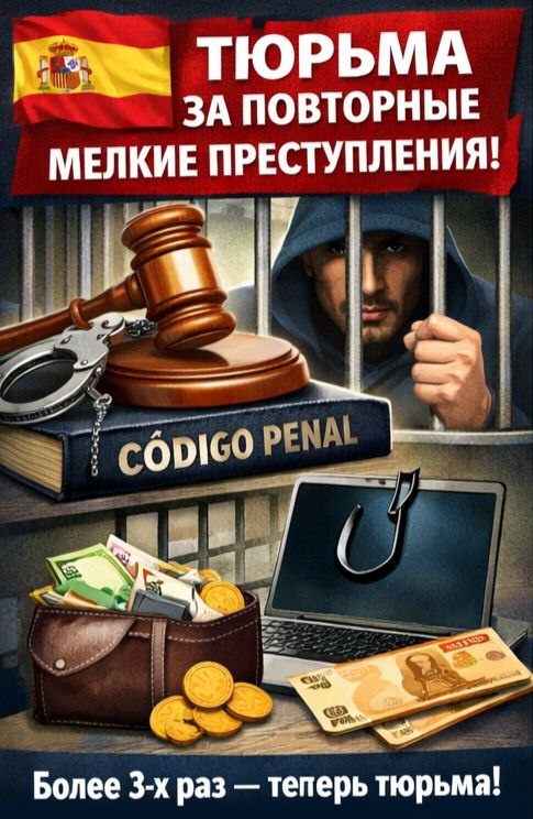 Теперь любое мелкое преступление (кража, мошенничество, интернет-мошенничество и другие мелкие преступления на сумму до 400 евро), совершённое более трёх раз, может привести к тюремному заключению. Раньше каждое мелкое преступление рассматривалось отдельно, и за него обычно назначался только штраф без лишения свободы. Этим часто пользовались мошенники и мелкие воры, зная, что тюремное наказание им не грозит. Новый закон направлен на борьбу с такими систематическими преступлениями и усиление безопасности. Михаил Македонский. Адвокатская контора Легалифасиль Адвокаты, город Аликанте – более 30-ти лет успешно защищаем интересы наших клиентов! ДИСКЛЕЙМЕР : ДАННАЯ ИНФОРМАЦИЯ НЕ ЯВЛЯЕТСЯ ЮРИДИЧЕСКОЙ КОНСУЛЬТАЦИЕЙ. ДЛЯ ТОЧНОГО ОТВЕТА КОЛЛЕКТИВУ НАШЕЙ АДВОКАТСКОЙ КОНТОРЫ НЕОБХОДИМО ОЗНАКОМИТЬСЯ СО ВСЕМИ ДОКУМЕНТАМИ ПО ЗАДАННОМУ ВАМИ ВОПРОСУ И ПРОВЕСТИ ЮРИДИЧЕСКУЮ КОНСУЛЬТАЦИЮ. #Юристмакедонский #Адвокатыиспания #юристмакедонский