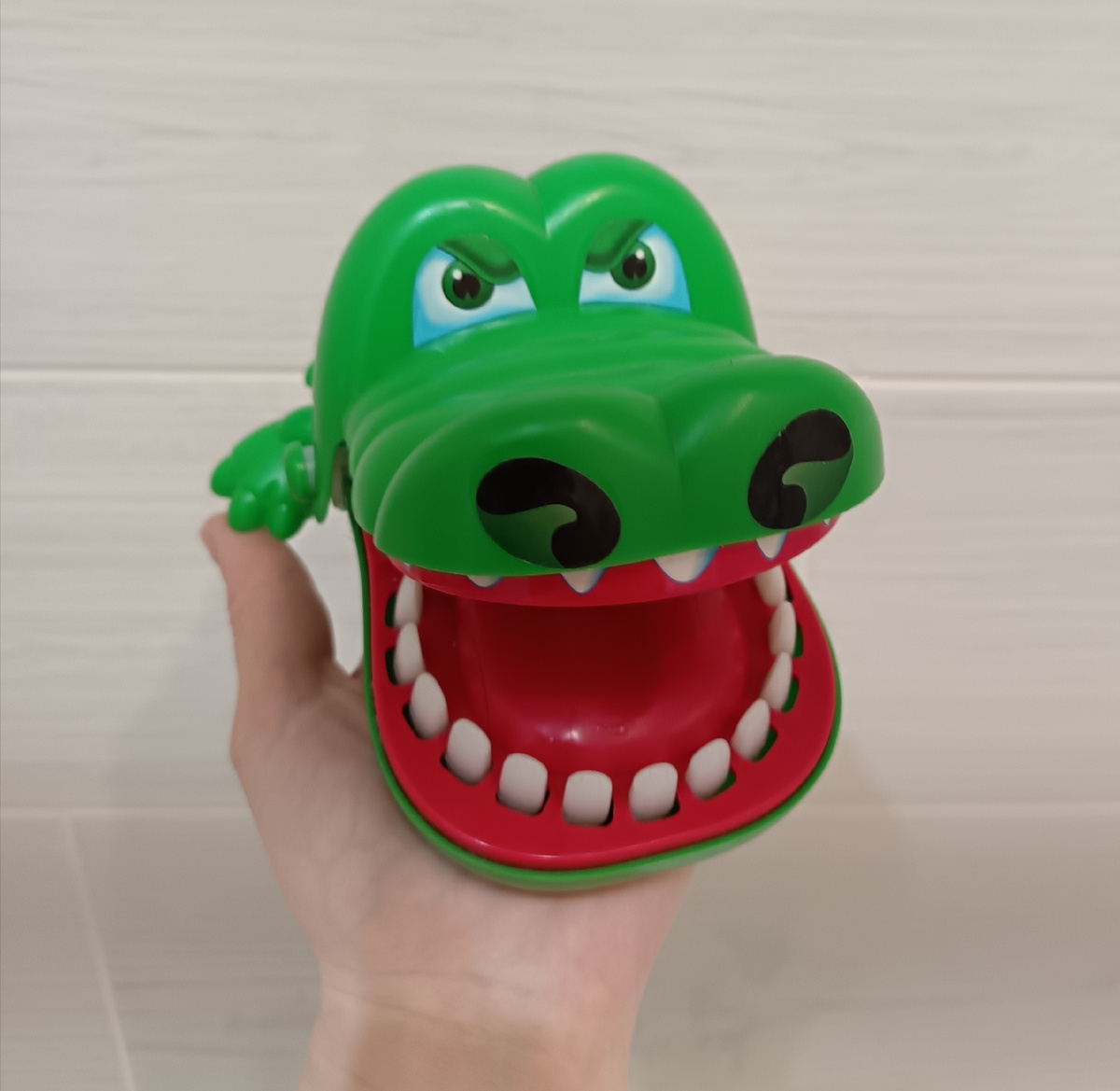Вот до чего дошло, даже фотки нет, что бы прилепить. Покажу одну из последних любимых китайских игрух. Можно играть одному или вдвоём. Нужно нажимать на зубы крокодилу. При нажатии на один из зубов (а он каждый раз меняется) челюсть у крокодила закрывается. Ребёнок в восторге, играем уже не один день. Тот кто нажал "на больной" зуб и челюсть закрылась, тот и проиграл.