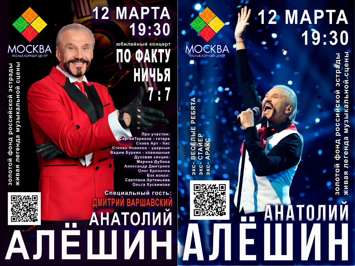 Именно так назван юбилейный концерт, который состоится 12 марта в столичном Фольклорном Центре “Москва”. Об этом в своем паблике в соцсетях сообщил экс-вокалист ансамблей "Веселые ребята" и "Аракс" Анатолий Алёшин.