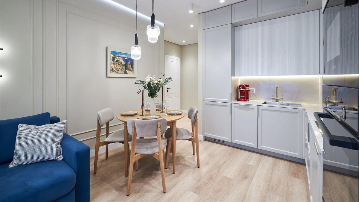 За счёт мебели, техники и картин на стенах получился современный интерьер. А молдинги и филёнчатые кухонные фасады придали ему нотку классики.