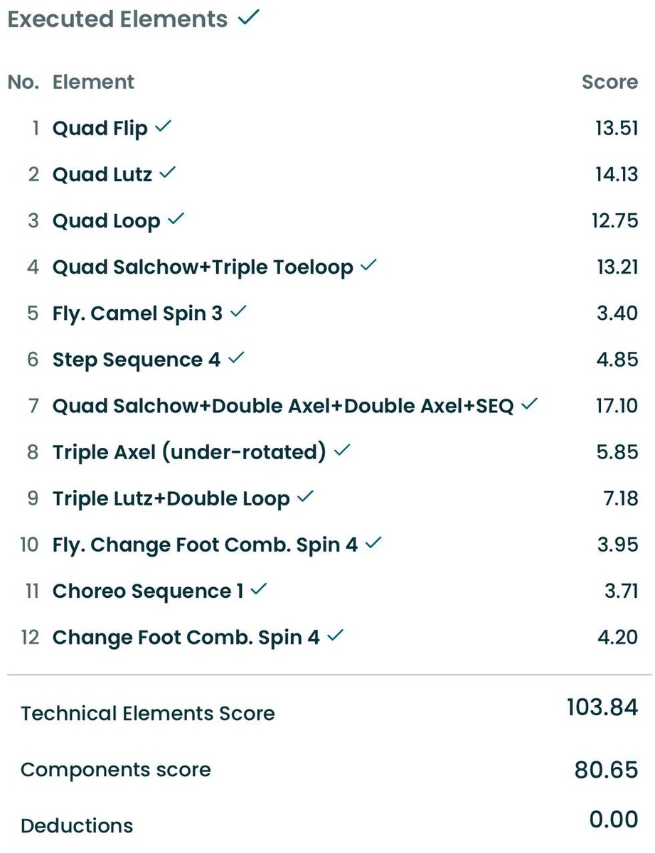 Тройной аксель + ойлер + четверной сальхов, четверной лутц, четверной тулуп, четверной флип, либела 3, четверной тулуп + тройной тулуп, тройной аксель, тройной лутц + двойной аксель, дорожка шагов 3 и волчок 4.