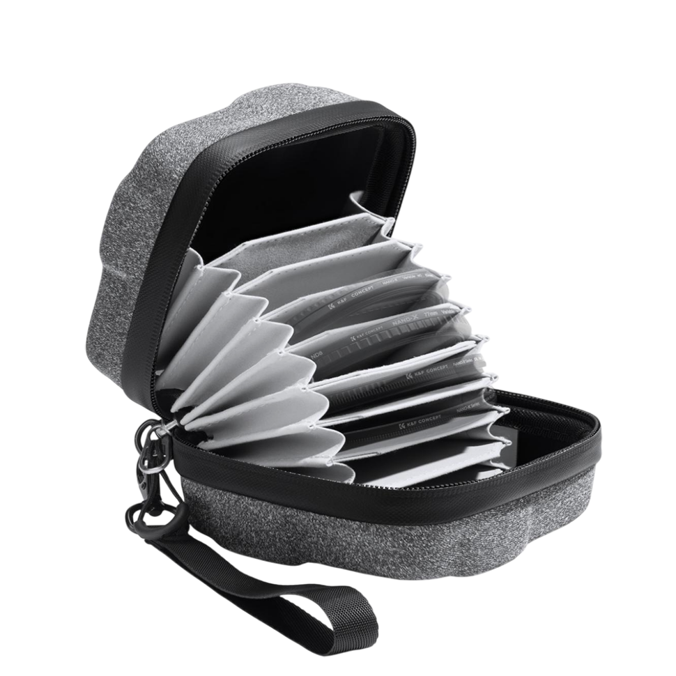 Назначение кейса выходит за рамки простой сумки: изготовленный из прочного EVA и мягкой микрофибры, он обеспечивает амортизацию и надежную фиксацию содержимого. Внутренние перегородки позволяют организовать фильтры по типам — от ND до CPL, — делая доступ к ним быстрым и удобным. Такой подход особенно важен для полевых съемок, где каждая минута на счету, а оборудование подвергается рискам от дождя, ударов или случайного смешения.