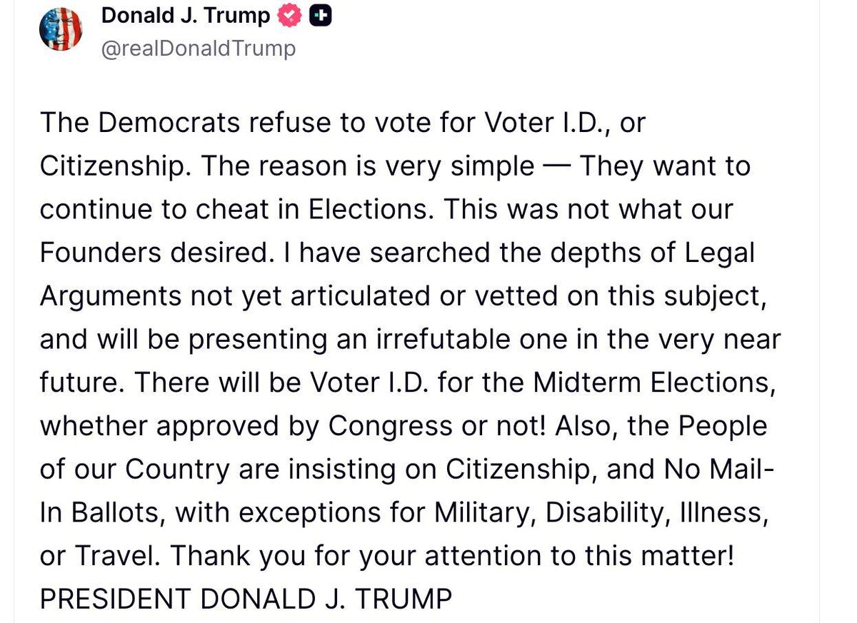 Trump says Democrats do not want voter ID because ‘THEY WANT TO CONTINUE TO CHEAT IN ELECTIONS’