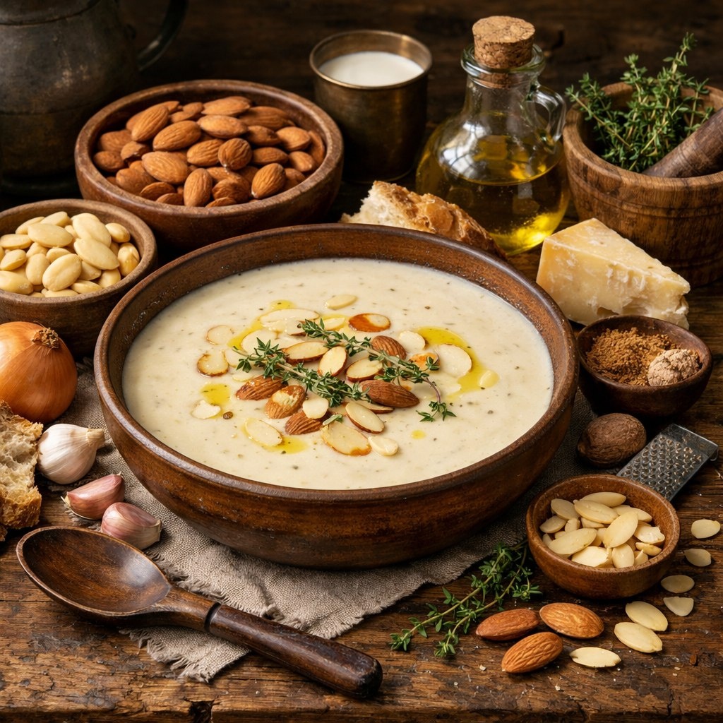 Миндальный суп - одно из блюд, которое пережило тысячелетия, почти не изменившись. В средневековье, когда миндаль был не просто продуктом, а настоящим спасением для поваров - суп часто был на слуху у народа. Почему такое странное блюдо нашло место на столе, спросите вы…:)