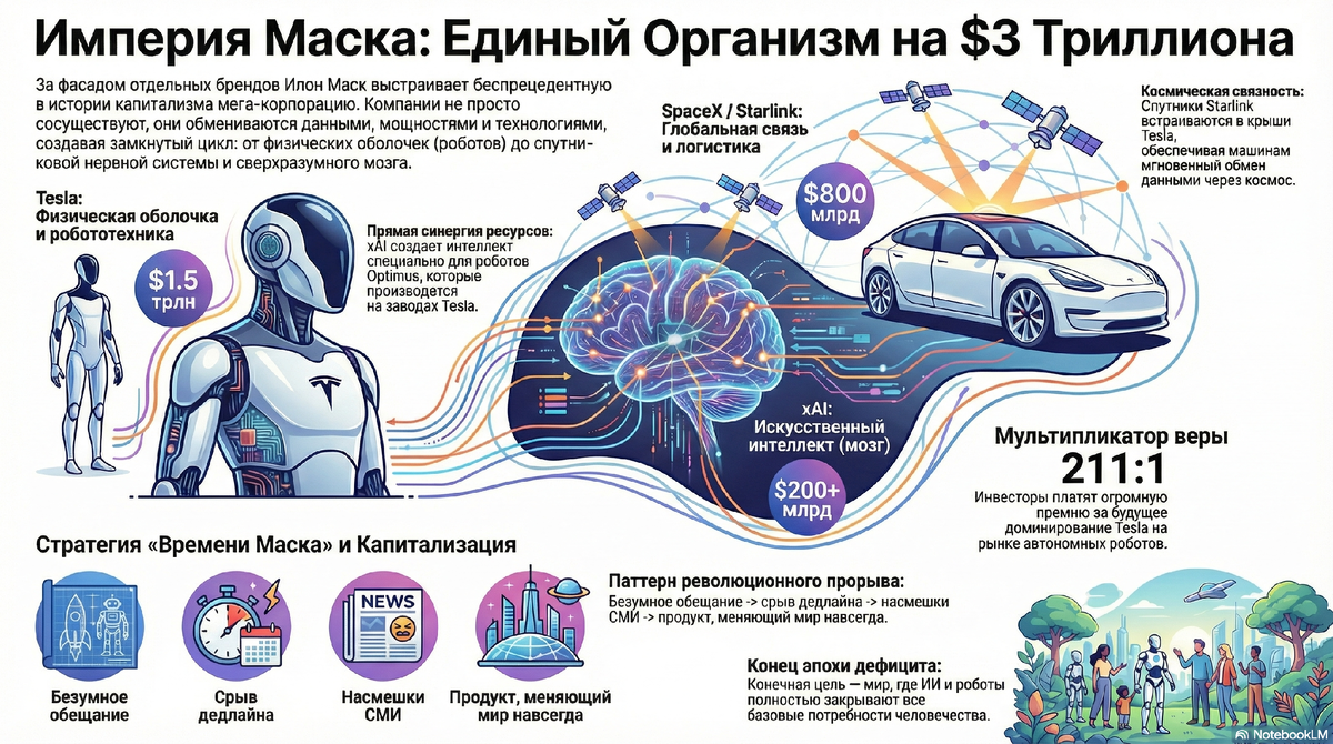 Прямо сейчас формируется мегакорпорация стоимостью в 3 триллиона долларов, которой технически даже не существует на бумаге. Это структуры Tesla, SpaceX, xAI и Neuralink, которые принадлежат одному человеку, подпитывают друг друга ресурсами и движутся к единой цели.