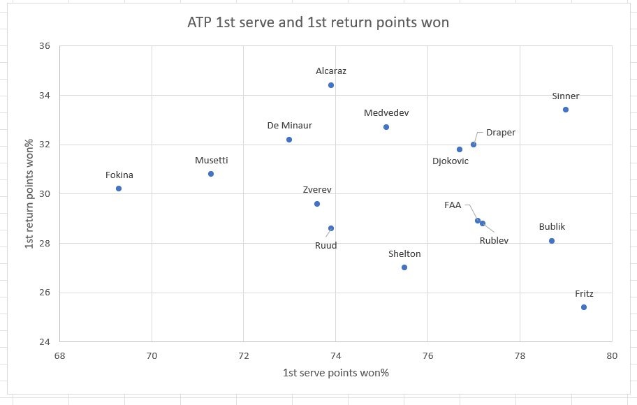 📊 Топ-15 игроков ATP по проценту выигранных очков на первой подаче и первой подаче соперника за последние 52 недели.
