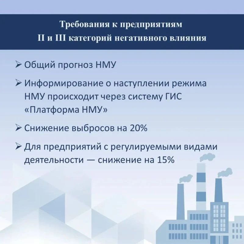 Крупные компании, отнесенные к I категории негативного воздействия на окружающую среду, будут обязаны заключить договоры с территориальным органом Росгидромета для получения специализированных прогнозов НМУ с учетом особенностей своего производства. Для них установлены следующие нормативы снижения выбросов при объявлении режима неблагоприятных метеорологических условий (НМУ): - I степени – не менее 15%; - II степени – не менее 20%; - III степени – не менее 40%. Для предприятий электро-, газо-, тепло- и водоснабжения, водоотведения и обращения с отходами нормативы смягчены и составят 5%, 10% и 20% соответственно. Предприятия II и III категории негативного воздействия будут ориентироваться на общий прогноз, который публикуют в государственной информационной системе «Платформа НМУ». Для них предусмотрено единое обязательное снижение выбросов на 20% от нормативного объема. Для аналогичных предприятий в сфере ЖКХ этот норматив составит 15%. Всем природопользователям, которые уже предста