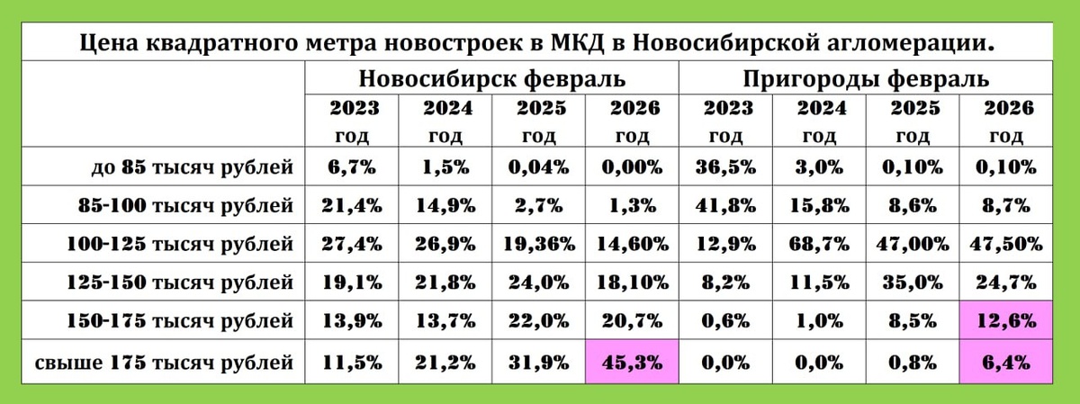 Средневзвешенная цена предложения квадратного метра в новостройках города выросла с февраля 2023 года по февраль 2025 года на 25,5%, со 126 980 до 159 350 руб. а за последний год — до 173 180 руб. или на 8,7%. За это же время цена квадрата в новостройках в пригороде Новосибирска увеличилась на 35,0%, с 90 750 до 122 520 руб., а с февраля 2025 года на 5,3%, до 129 073 руб. ❗️Динамика цен уменьшилась в Новосибирске в полтора, а в пригороде в 3,3 раза. Это связано с тем, что в 2024 году часть знаковых застройщиков Новосибирска начала строительство объектов в пригороде, что привело к резкому росту цен. 📍 Значительная часть застройщиков, осваивающих пригород, это вертикально интегрированные компании. Их задача — держать низкие цены, чтобы загрузить собственные заводы по производству строительных материалов и увеличить долю рынка. На старте, в новых комплексах на окраинах, появились совсем маленькие студии, где цена пробила планку 175 тыс. руб. за квадрат. Сейчас в новых домах в пригор