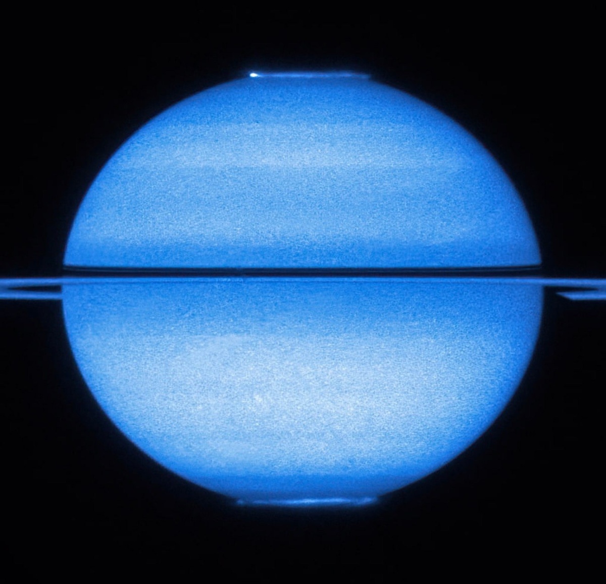 Сатурн в ультрафиолетовом свете, запечатленный космическим телескопом NASA/ESA "Хаббл". В этом диапазоне отчетливо видны полярные сияния над обоими полюсами.