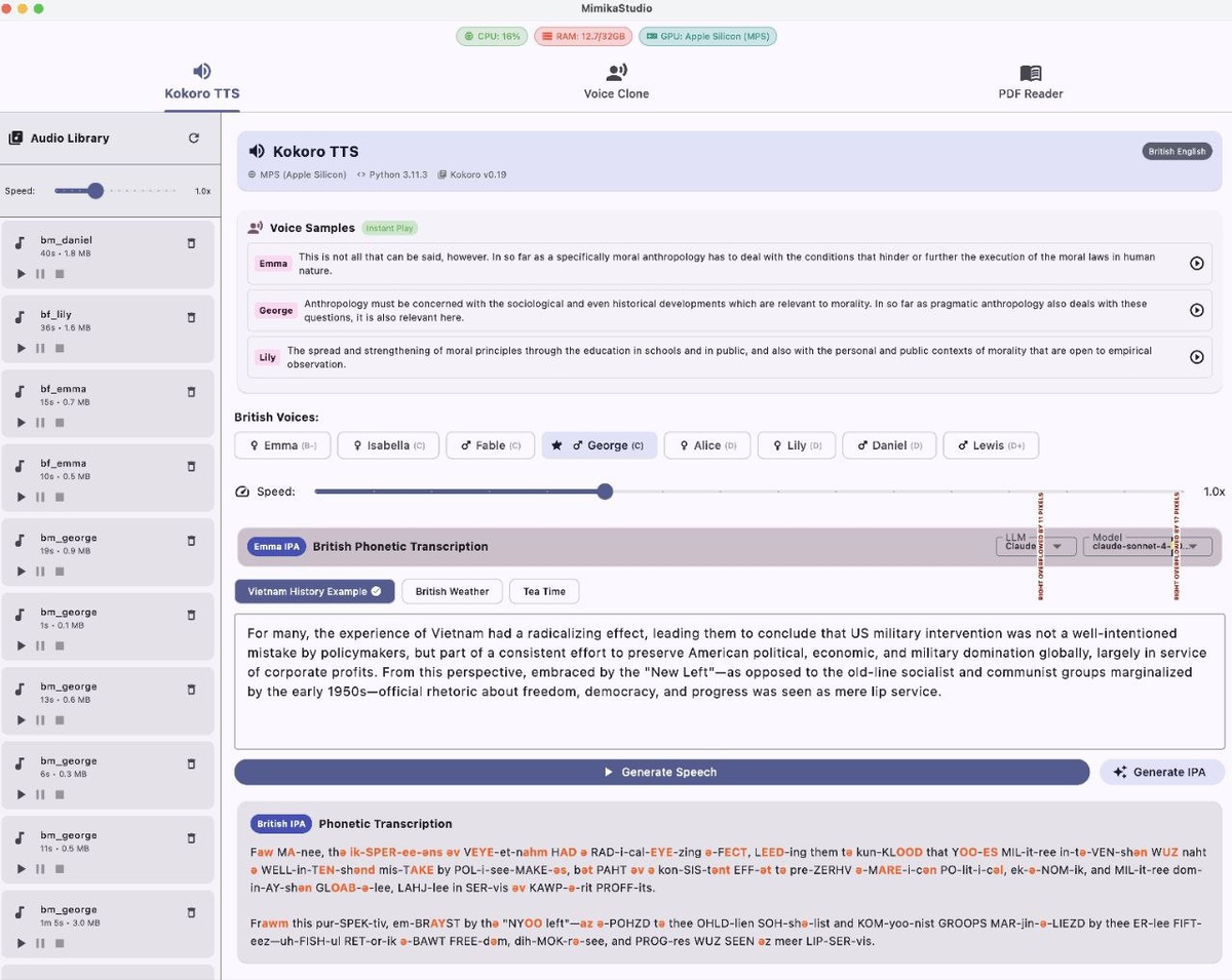mimikastudio позволяет: • Клонировать голос по трёхсекундному образцу • Генерировать речь • Создавать аудиокниги и озвучивать текст • Работать с 23 языками, включая русский Приложение доступно на macOS, Windows и в веб-версии. Для работы требуется 8 ГБ ОЗУ. Доступны локальные модели, которые можно скачать бесплатно. https://dzen.ru/id/5c0e38ff46ef5c00aaa80527