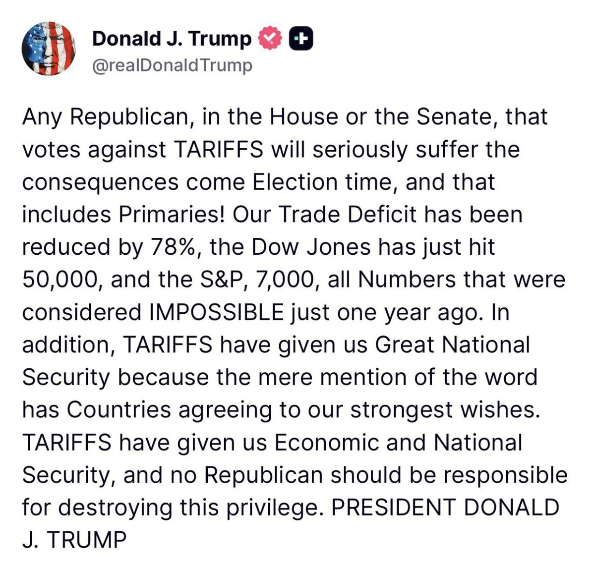 Trump warns any Republicans voting against tariffs 'will seriously SUFFER the consequences come election time' 'No Republican should be responsible for DESTROYING this privilege'