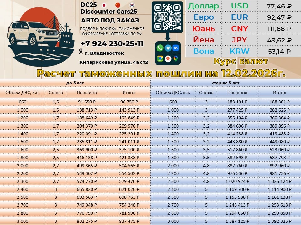 от Discounter Cars25🚗 Приветствуем! 👋 Чтобы Вам было проще планировать бюджет, мы собрали для Вас ключевые цифры на 12 февраля. Друзья, если Вы рассматриваете автомобиль из Японии, Кореи или Китая, то ключ к выгодной сделке — в актуальных курсах. Каждая валюта влияет на Вашу будущую машину: 💴 Йена — определяет цену авто в Японии. 💵 Доллар (санкционный) — используется для расчёта за авто с объёмом от 1.9 л. 🇨🇳Юань — курс для покупки в Китае. 🇰🇷 Вона — основа для сделок в Корее. 💸 Евро — по нему проходит таможенное оформление в РФ. Именно эти цифры позволяют нам просчитать конечную стоимость «под ключ» без скрытых сюрпризов. Хотите себе автомобиль из Японии, Кореи или Китая? Для консультации и расчета, напишите или позвоните нашим специалистам: 📞 +79242302511 ✍️ Написать в What's App 🌐 Наша визитка ✔️ Мы на Drom.ru 🚗 📱 Мы в ВК ✔️ Мы в Дзен ‼️Удачного дня‼️ DC25 Discounter Car's25. АВТО под ЗАКАЗ 🇯🇵🇰🇷🇨🇳 г. Владивосток ул. Кипарисовая 4-А ст2. Удачного дня и о