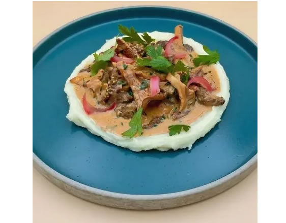 - Сервировка. Выложите на тарелку картофельное пюре, сверху добавьте приготовленный бефстроганов с лисичками.